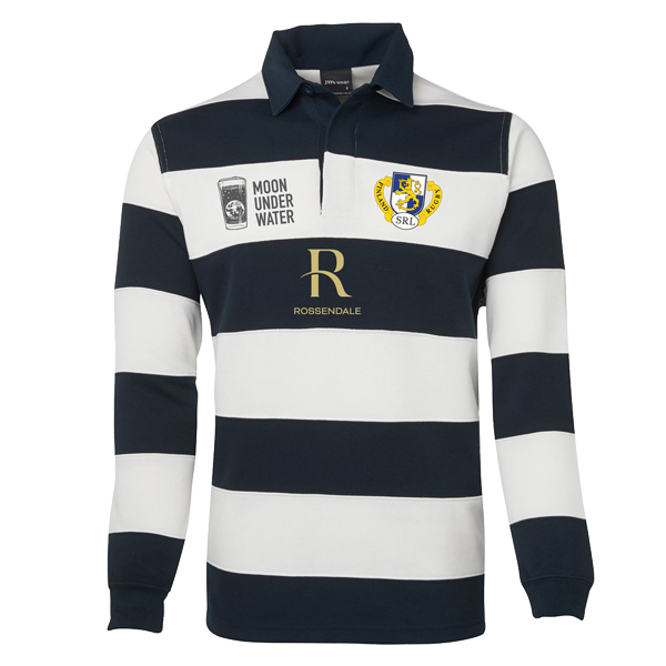 A bespoke Moon under Water navy/white striped rugby jersey to show your support.